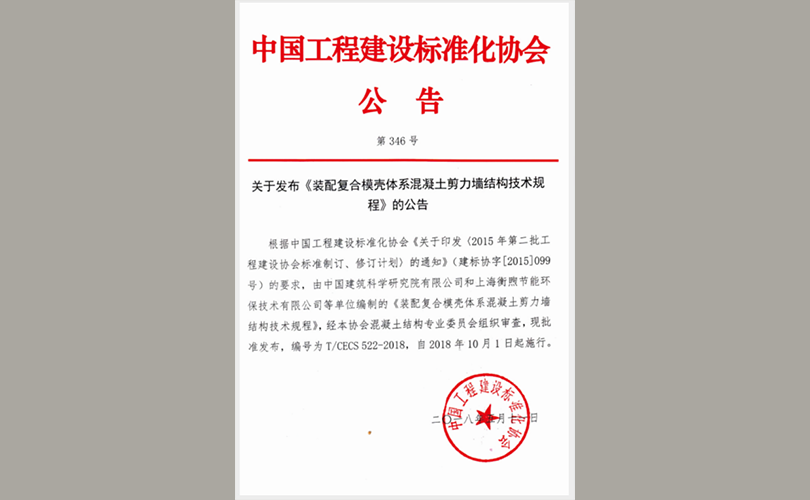 TOP模殼技術(shù)被納入中國工程建筑協(xié)會的CECS標準,自2018年10月1日起執(zhí)行。